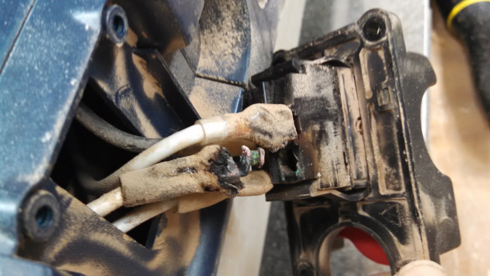 Last Wednesday my Ryobi bench-top planer quit working. Seemed to be an electrical problem with the switch. I removed the switch (after unplugging the machine) to find three wires - one completely burned through, one scorched and the other seemingly okay. The socket for the completely burned wire was melted into a glob of burned plastic. Not a good thing in my mind.